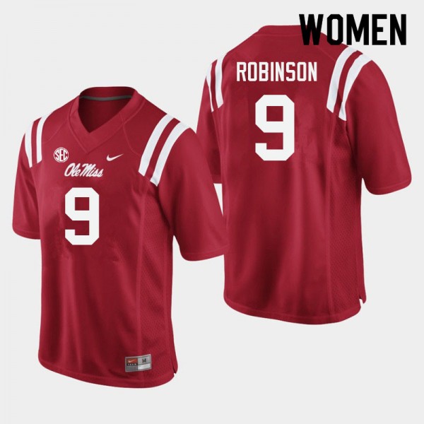 Collectible Womens Jaylon Robinson #9 Ole Miss Red Applique Player Football Jersey - Premium Licensed NCAA Gear 18865-328